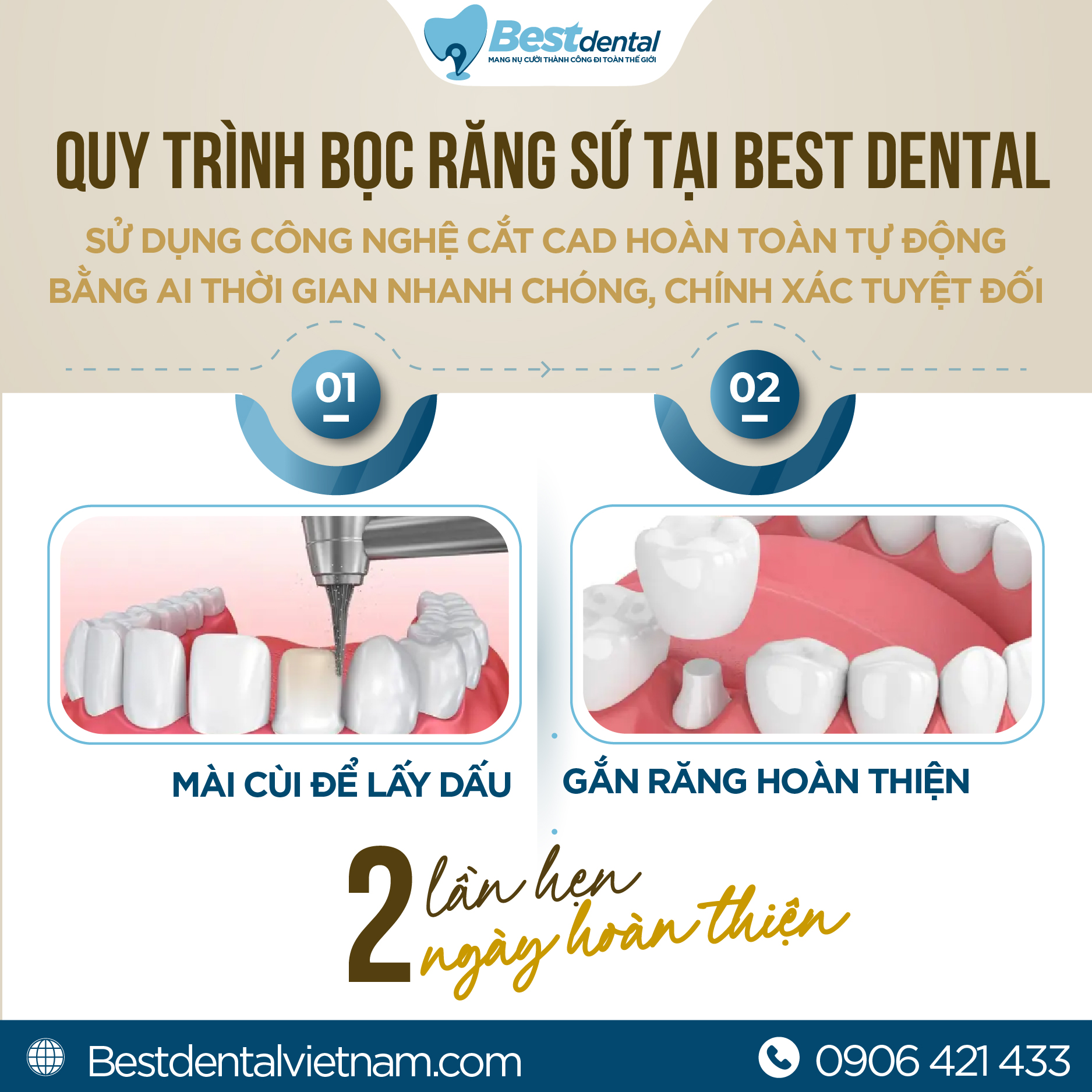 Chỉ với 2 lần đến nha khoa, bạn đã có thể hoàn thiện hành trình thẩm mỹ răng sứ và sở hữu nụ cười trắng sáng – đều đẹp – hài hòa gương mặt. Tại Best Dental, quy trình được tối ưu chuyên sâu với công nghệ scan 3D hiện đại, thiết kế nụ cười cá nhân hóa theo từng khuôn mặt, kết hợp cùng đội ngũ bác sĩ nhiều năm kinh nghiệm, giúp mang lại kết quả nhanh chóng – nhẹ nhàng – thẩm mỹ bền lâu.