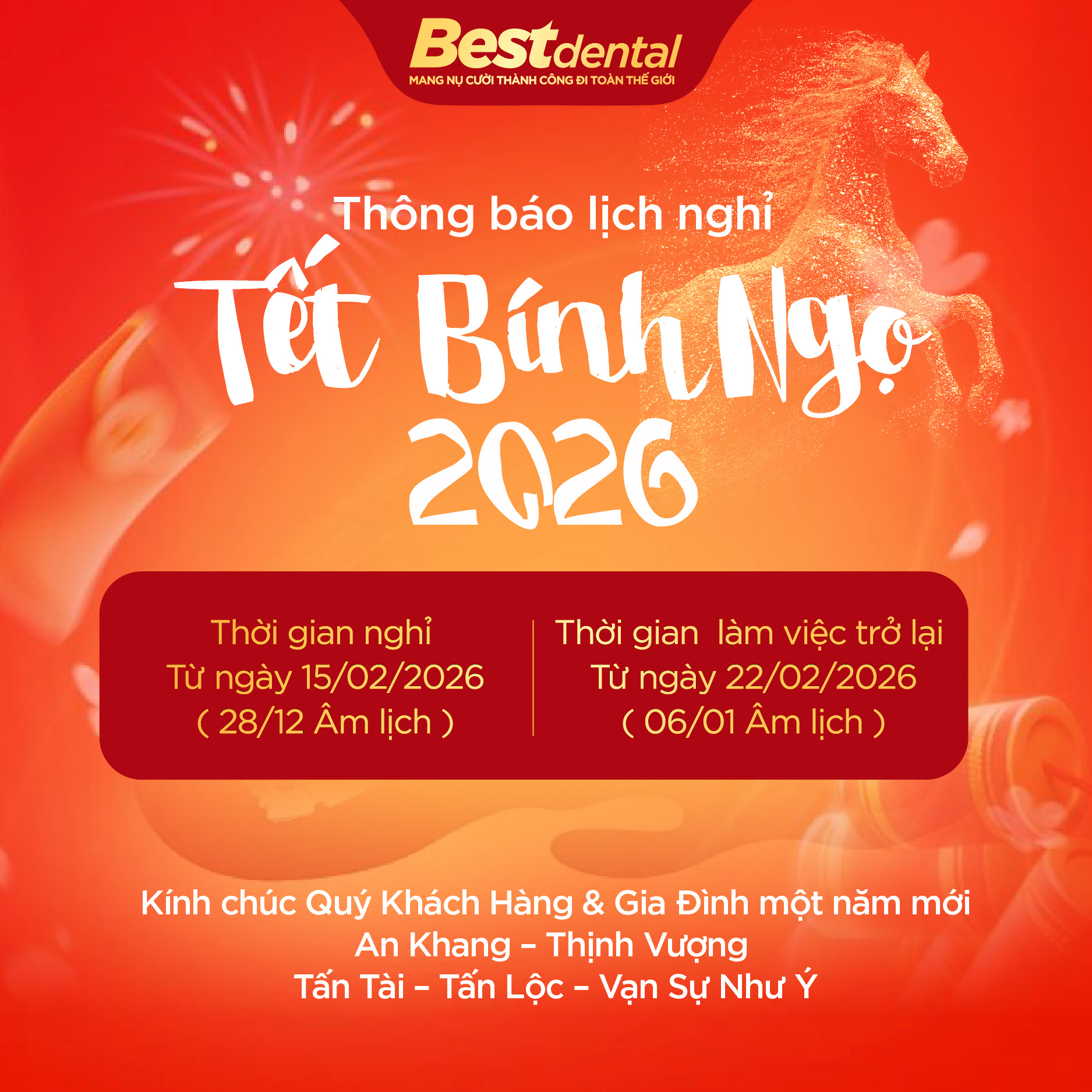 Nhân dịp Tết Nguyên Đán Bính Ngọ 2026, Best Dental xin trân trọng thông báo lịch nghỉ Tết như sau: