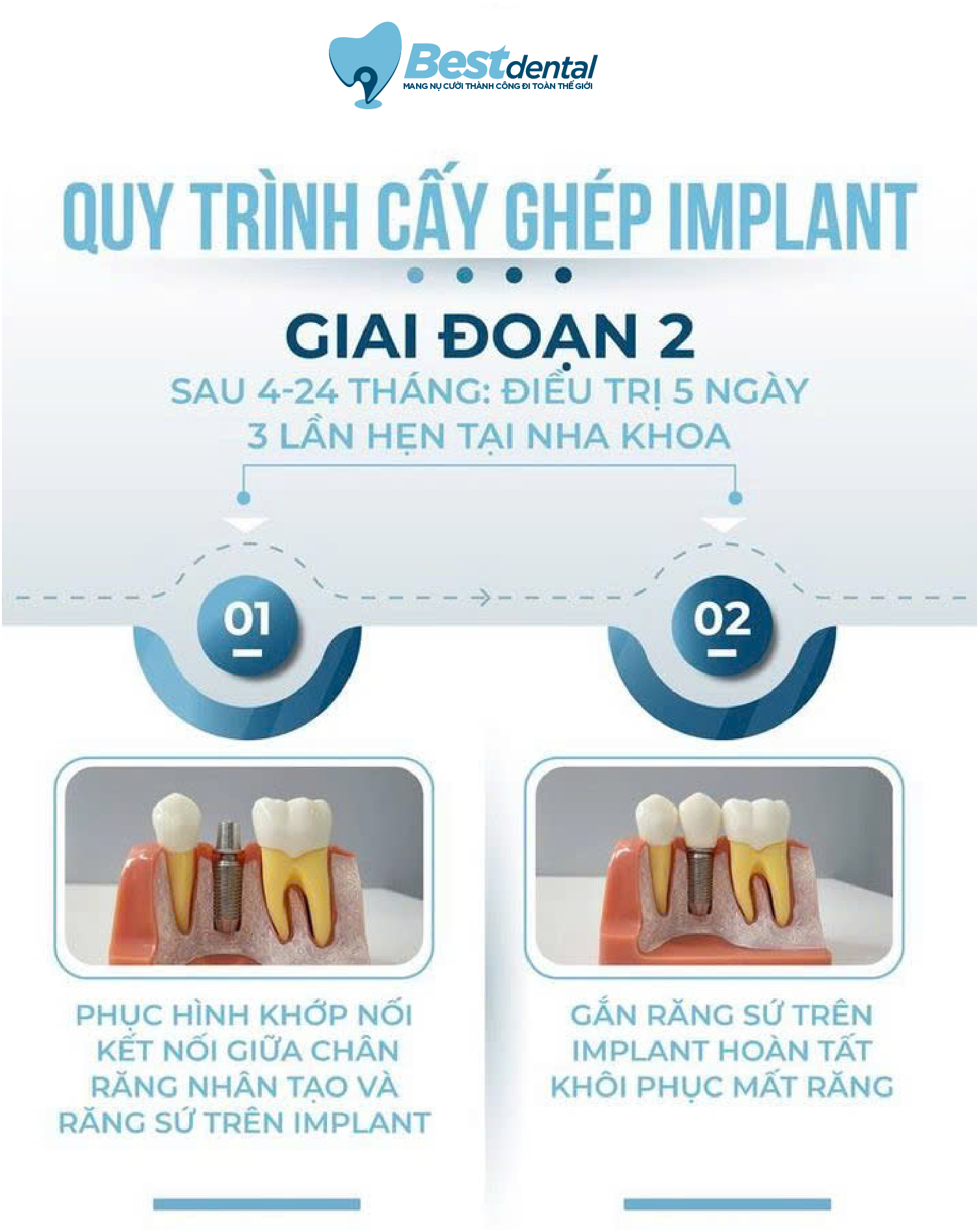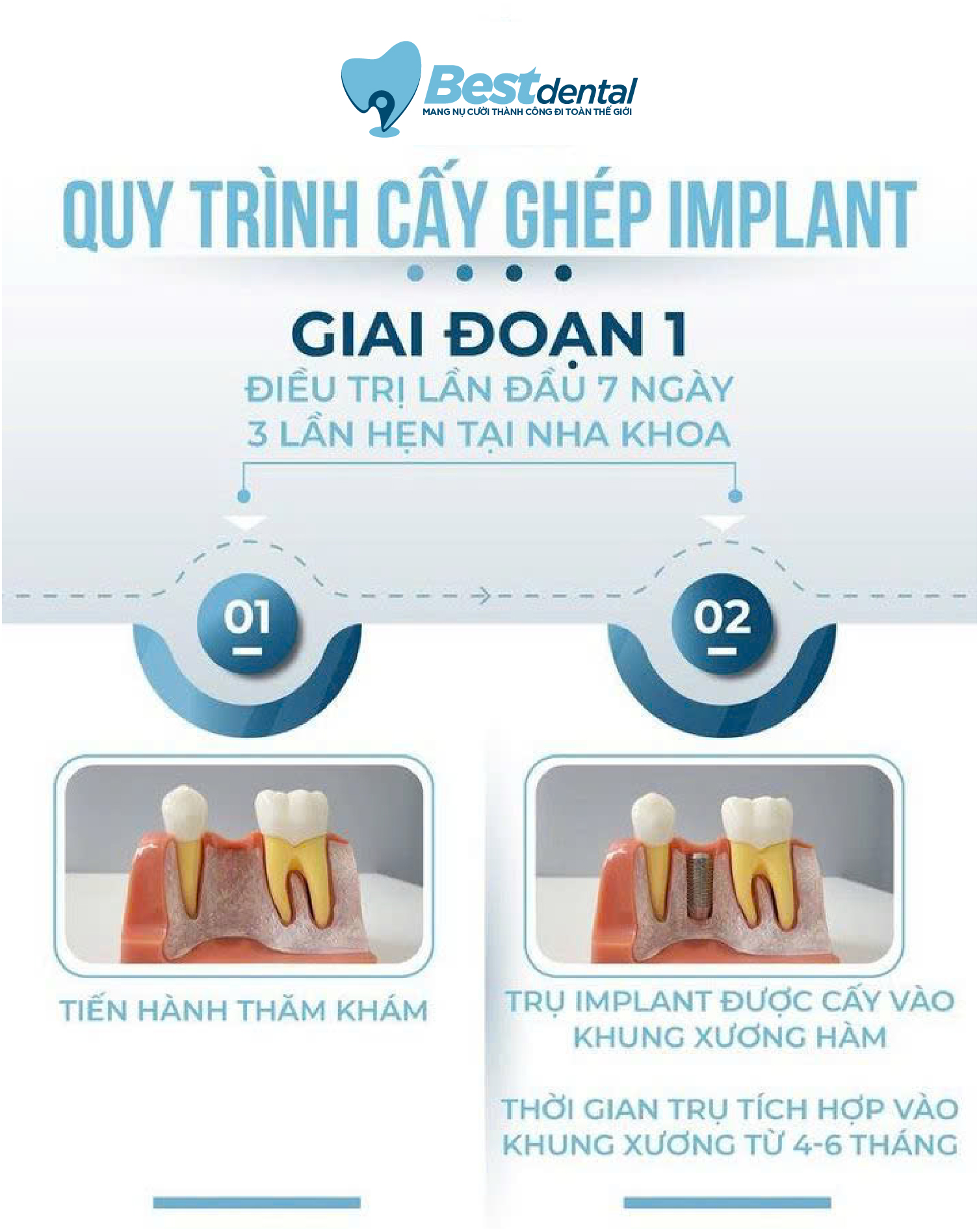 Để đảm bảo sự thành công và tuổi thọ lâu dài của răng Implant. Toàn bộ quy trình tại Best Dental được thực hiện bài bản qua 2 giai đoạn quan trọng.