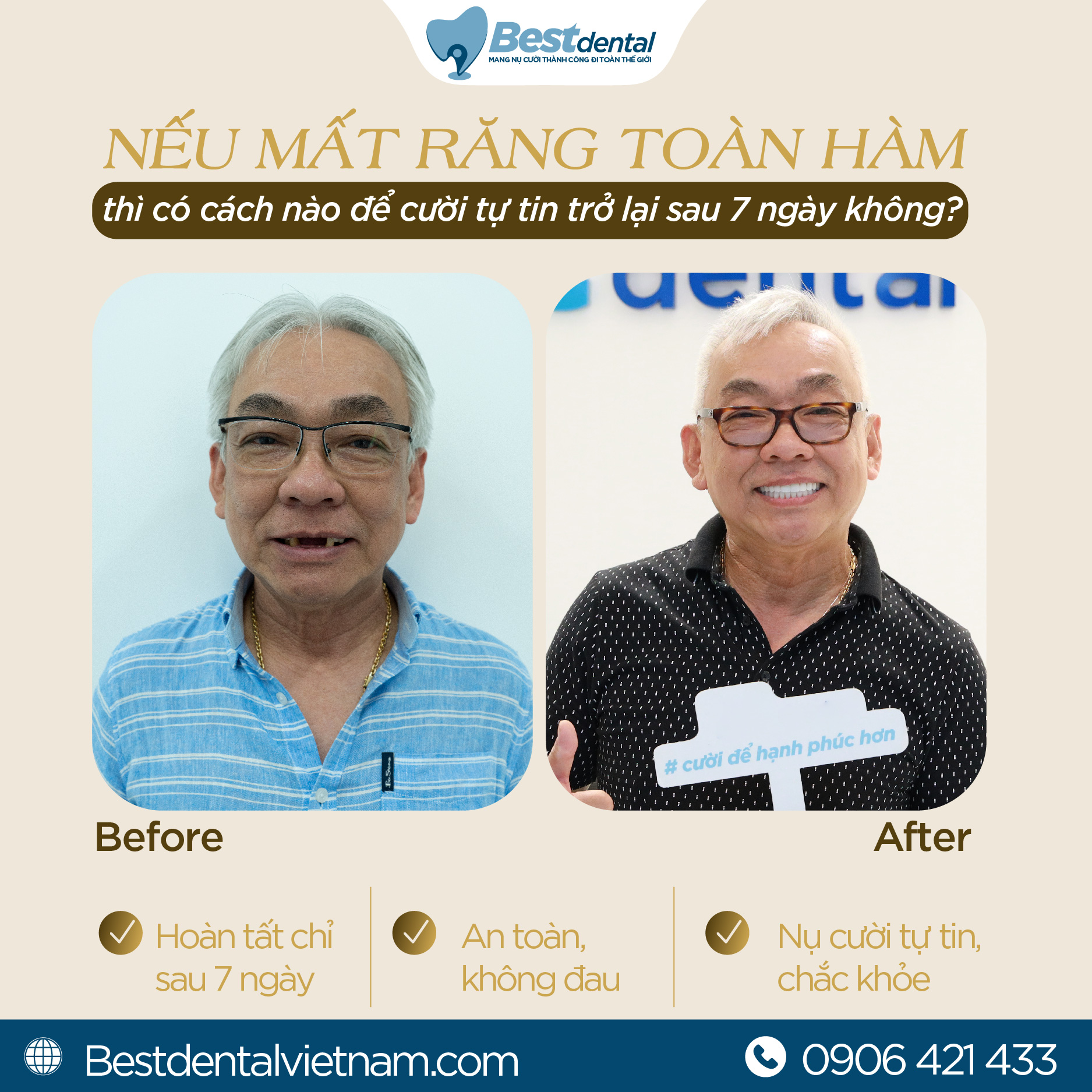 Nhưng giờ đây, cô chú hoàn toàn có thể lấy lại hàm răng chắc khỏe, đẹp tự nhiên chỉ sau 7 ngày nhờ phương pháp cấy ghép Implant toàn hàm tại Best Dental.